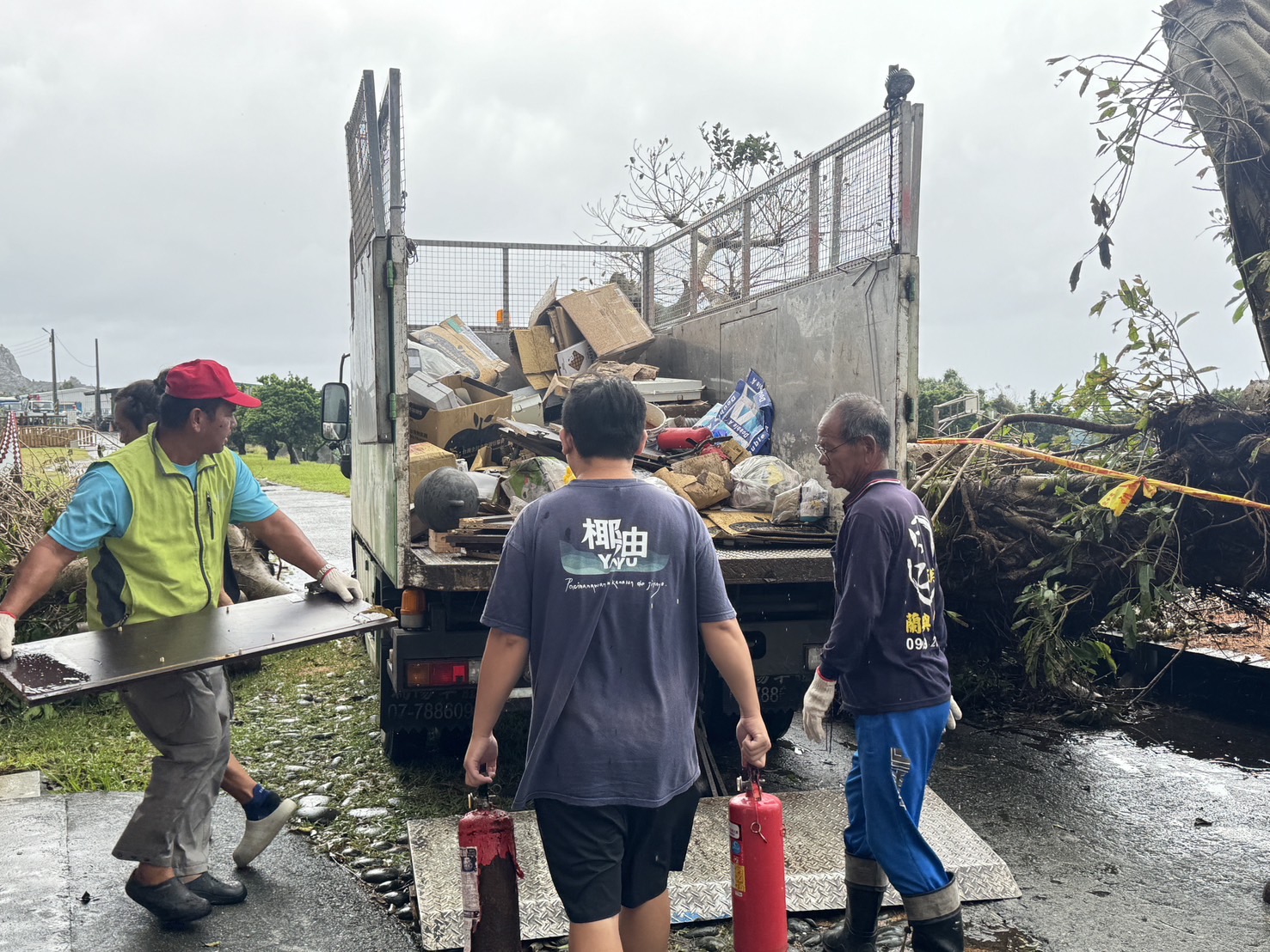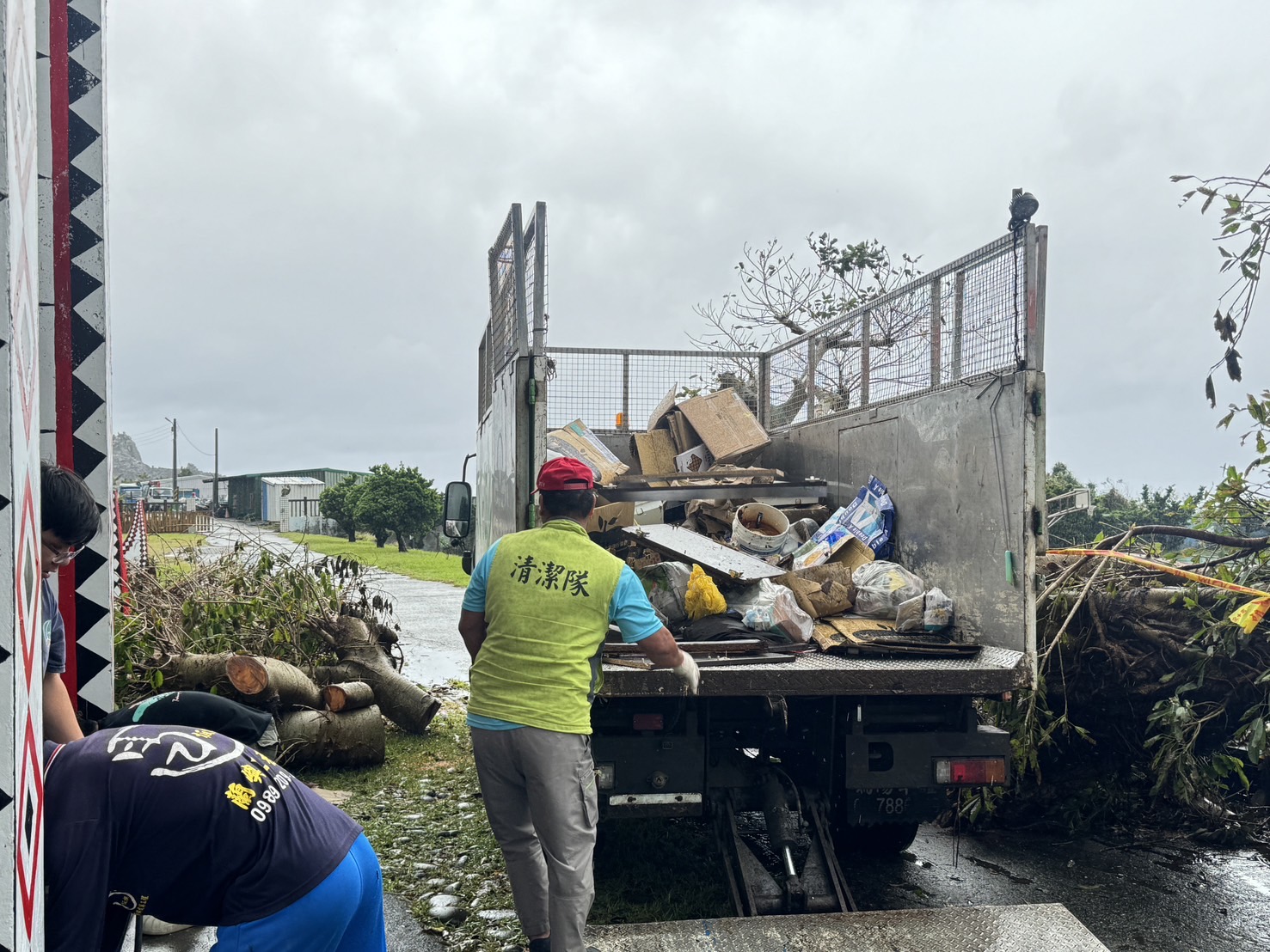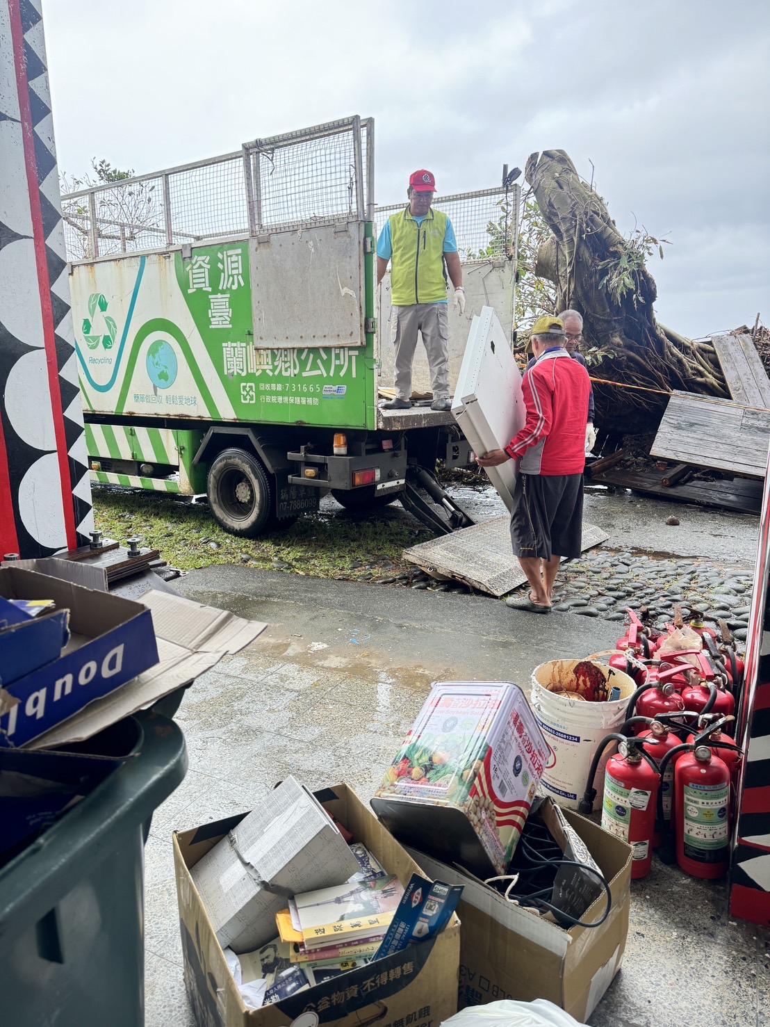 說明:康瑞颱風過後,學校遭受波及,產生大量的廢棄物。鄉公所清潔隊特來幫忙清運,學校連根拔起的大樹枝幹被鋸掉作其他用途,其餘的物品作好垃圾分類後清運。