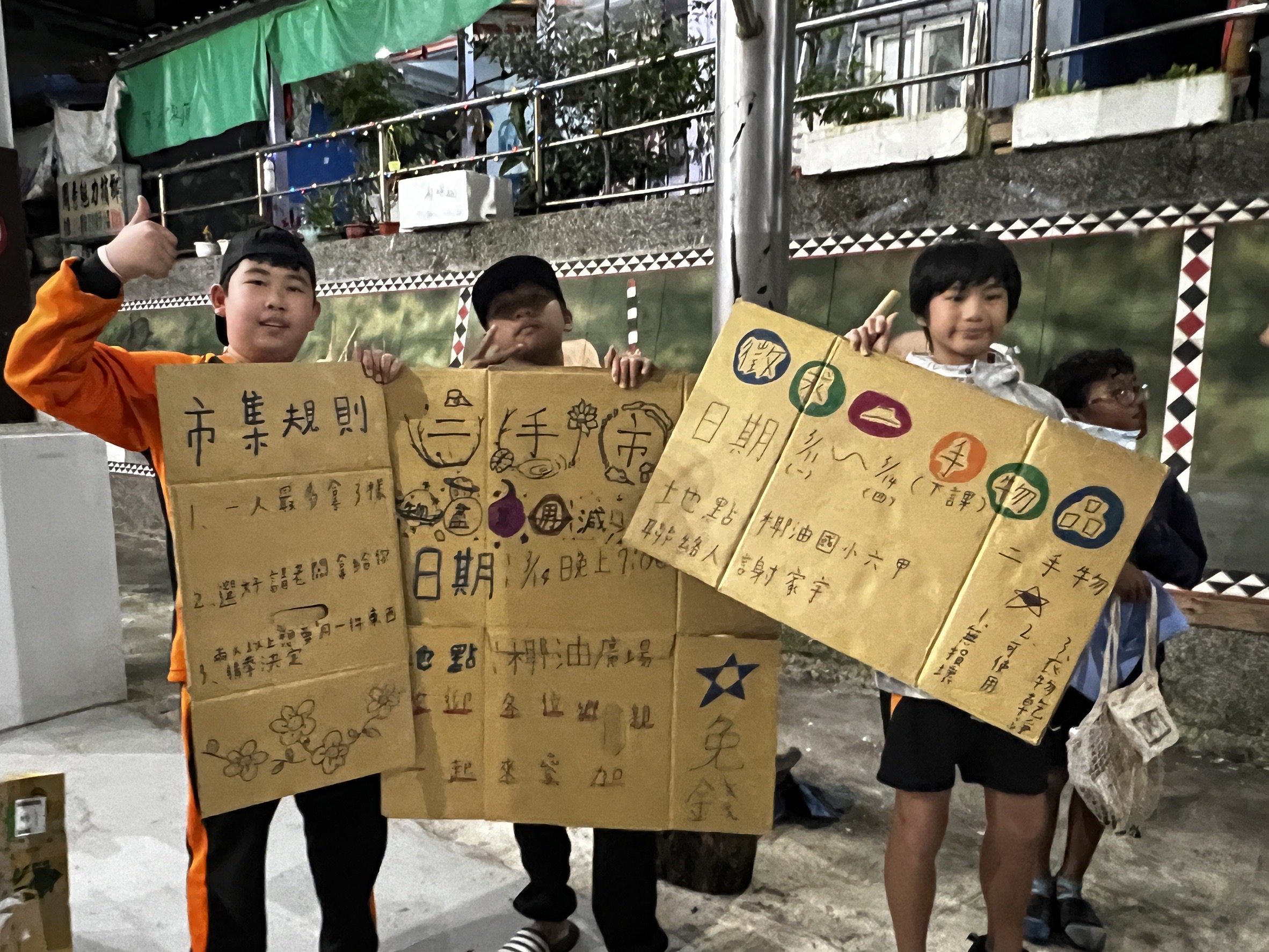六年級自發性發起二手免費市集活動,地點辦在椰油社區廣場。在前兩天先在校內收集二手物品,老師宣導學生物品必須是,乾淨、能使用。