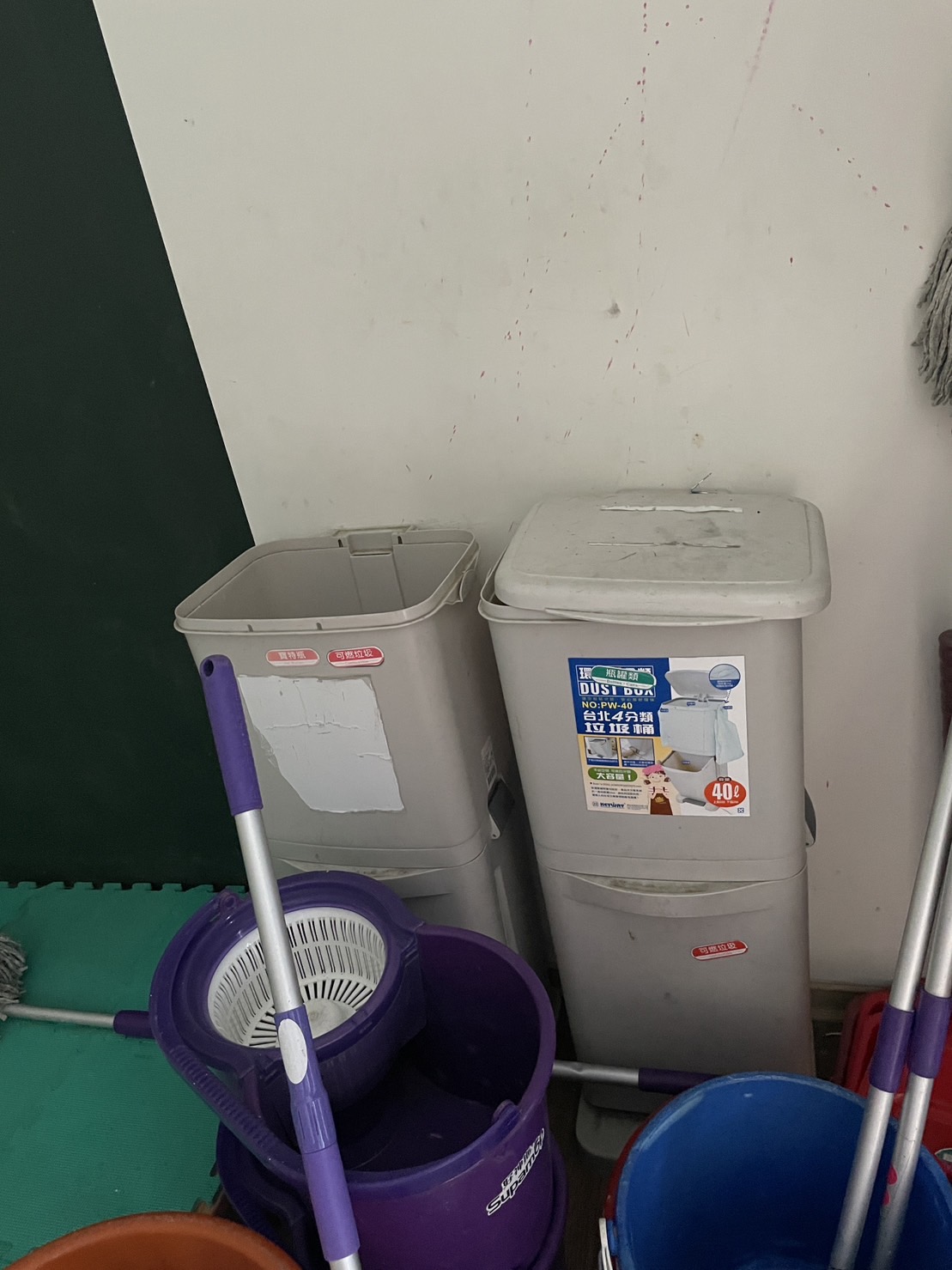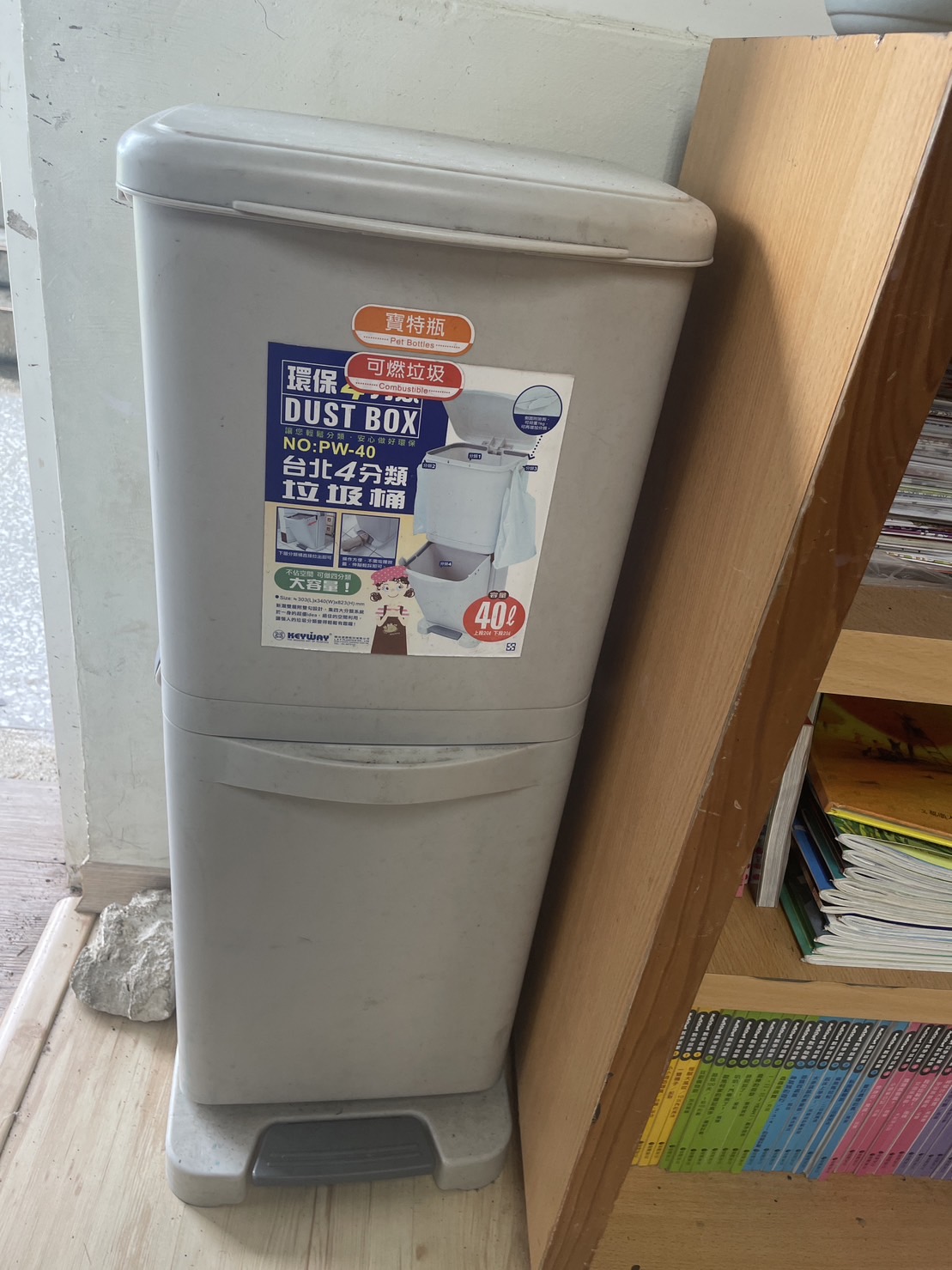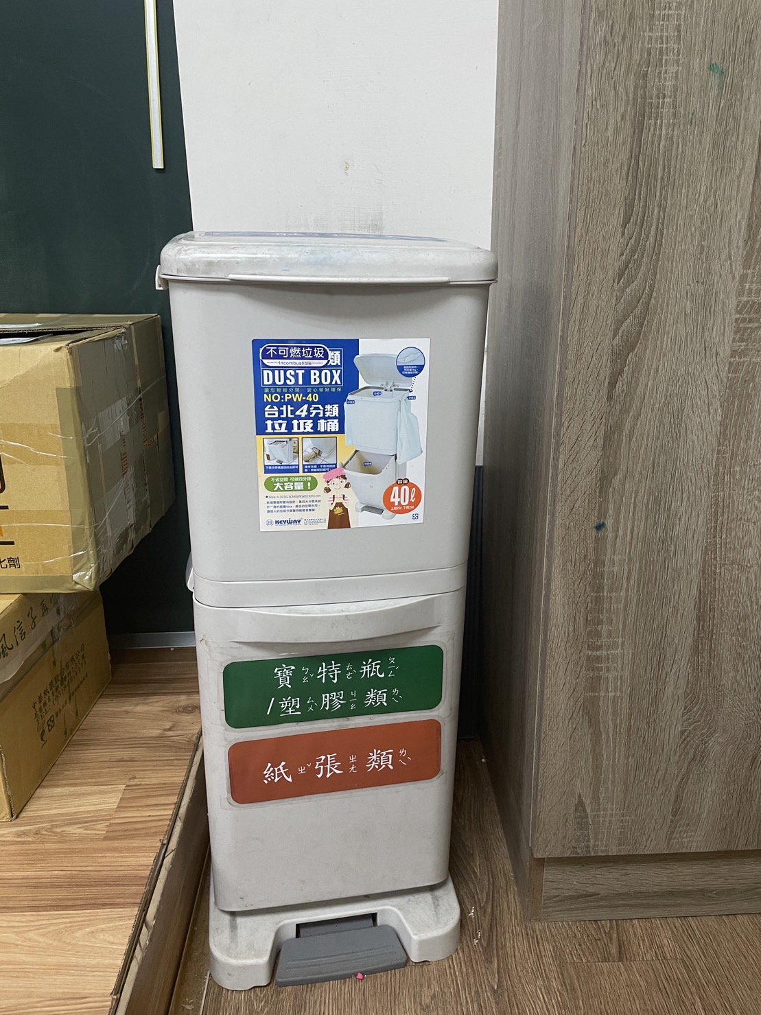 學校除設置大型的資源回收場之外,班級內也設置小型的垃圾分類回收桶。