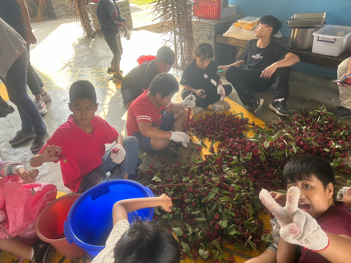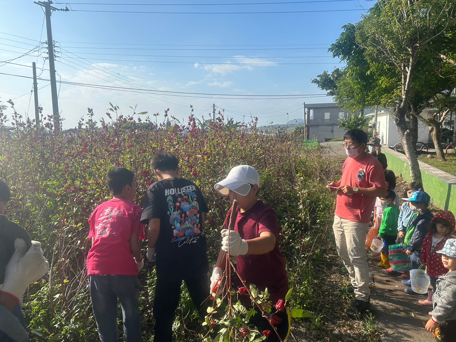 一、校園內種植的洛神花收成,讓學生一起參與採收。