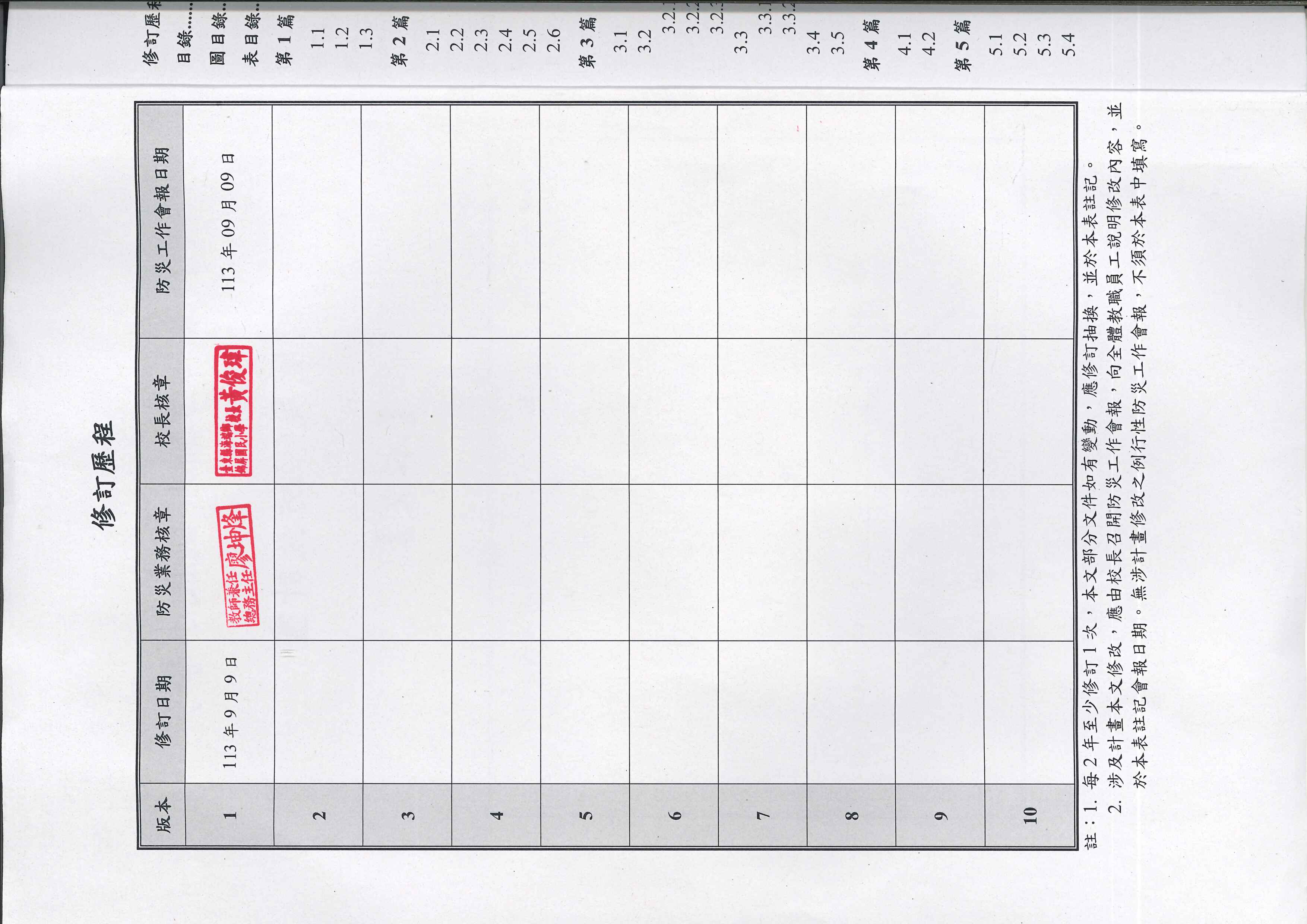附件檔案 : 【113學年校園災害防救計畫書-本文-1130930.pdf】 【防災救護書的簽.pdf】 【113學年校園災害防救計畫書-本文-1130930.docx】 【20250627155733516_0001.jpg】
