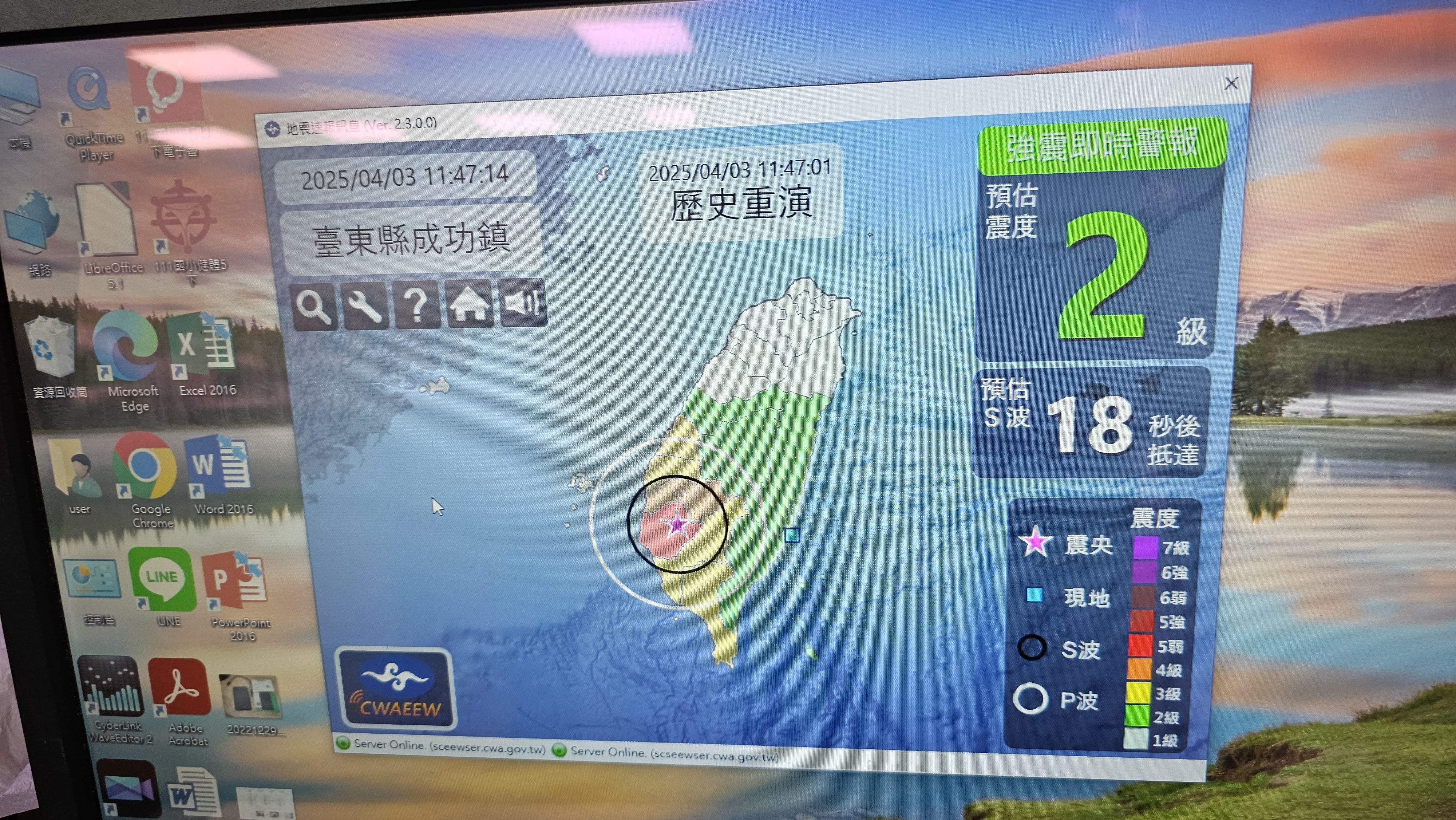 中央氣象局「強震即時警報系統」之電腦發布警示照片。